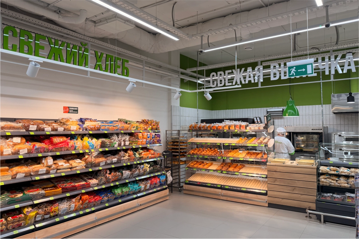 The fresh bakery area is equipped with specialized bread shelving designed by 4RM to meet the requirements for presentation and quality preservation of bakery products. Their design ensures optimal air circulation and convenience for the staff when replenishing the assortment.