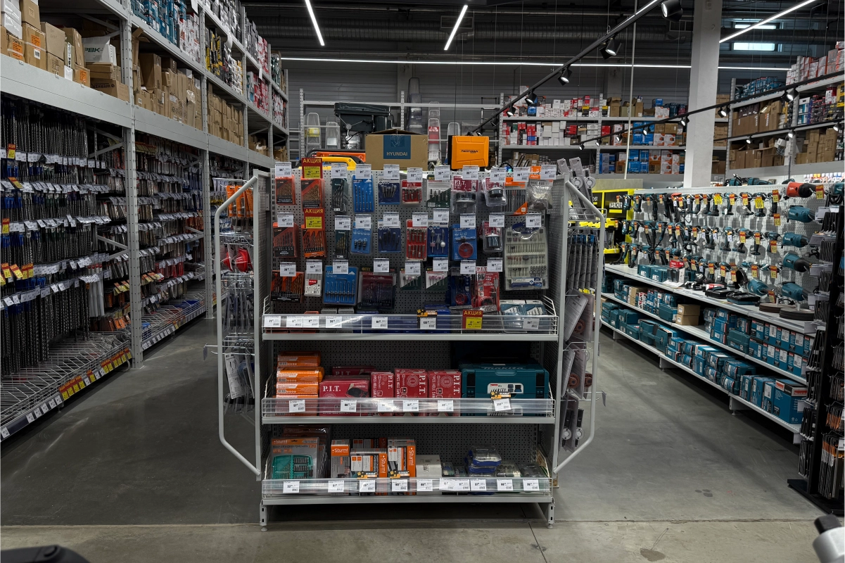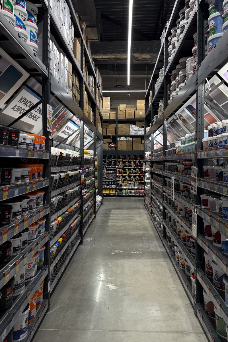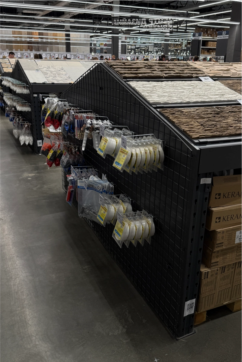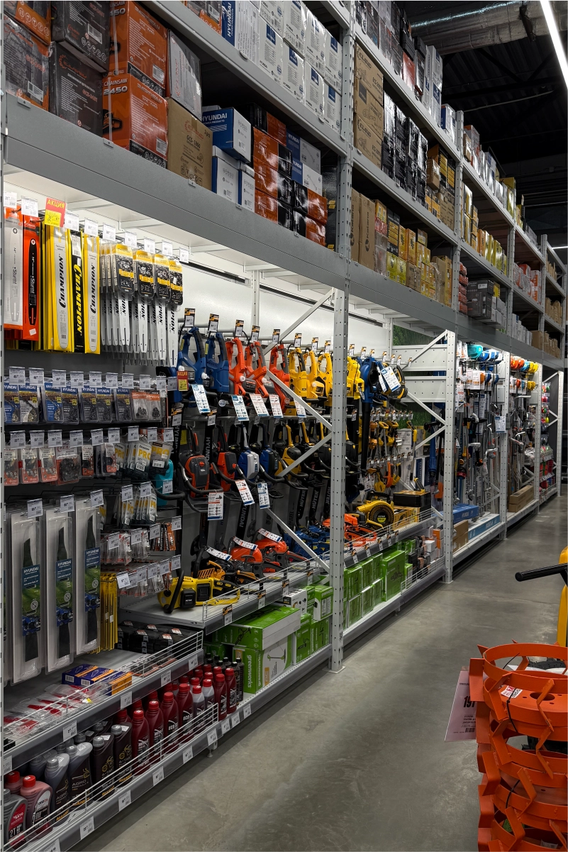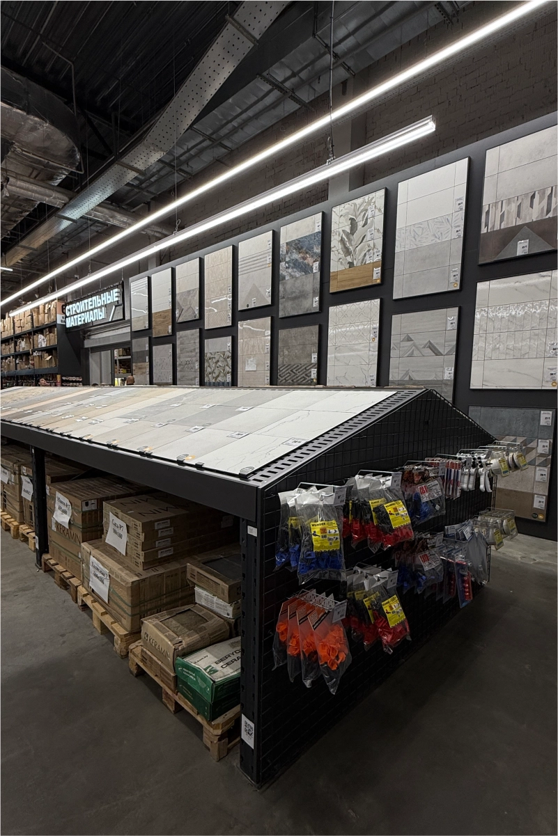 В торговом зале установлены металлические стеллажные системы, позволяющие эффективно размещать как мелкий крепёж и расходные материалы, так и крупные строительные товары — плитку, ламинат, сантехнику, электроинструмент. Оборудование выполнено из холоднокатаной стали толщиной 1,5–2,5 мм и покрыто порошковым полимерным составом, обеспечивающим долговечность и эстетичный внешний вид.