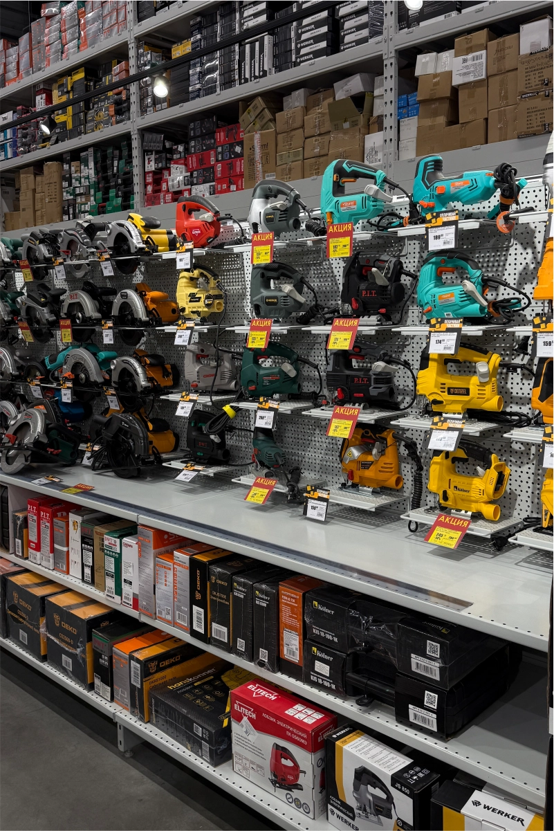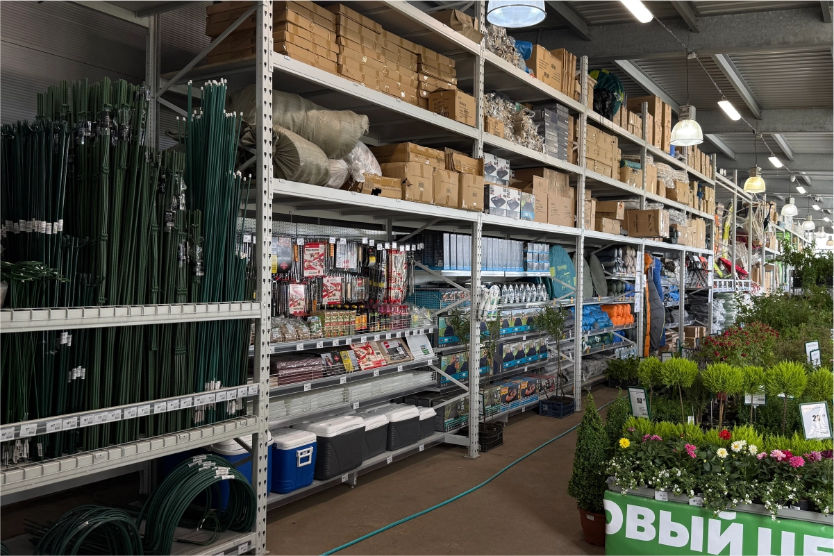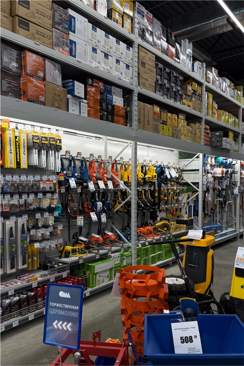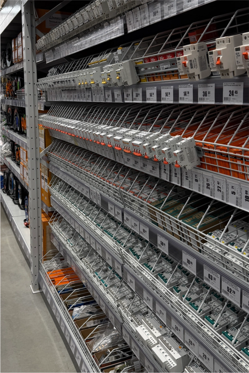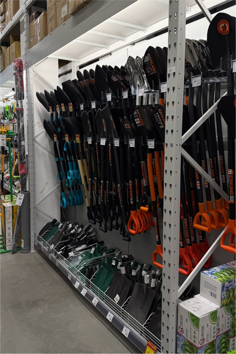 В торговом зале установлены металлические стеллажные системы, позволяющие эффективно размещать как мелкий крепёж и расходные материалы, так и крупные строительные товары — плитку, ламинат, сантехнику, электроинструмент. Оборудование выполнено из холоднокатаной стали толщиной 1,5–2,5 мм и покрыто порошковым полимерным составом, обеспечивающим долговечность и эстетичный внешний вид.