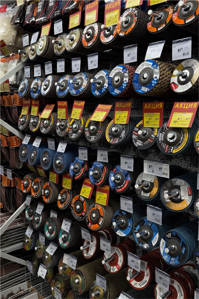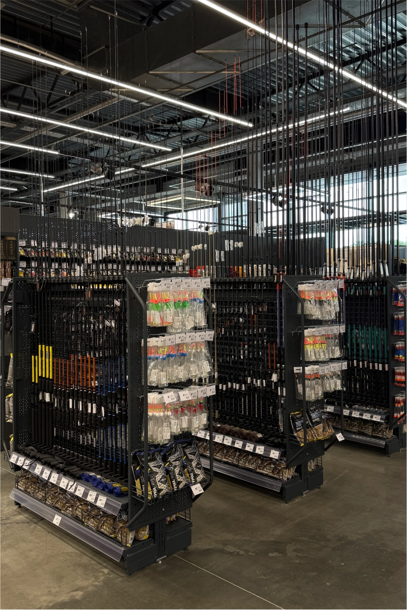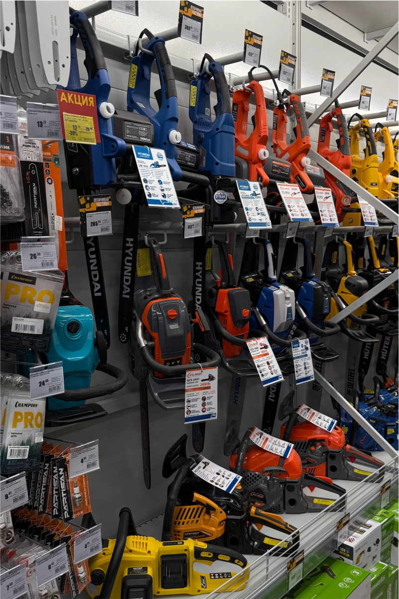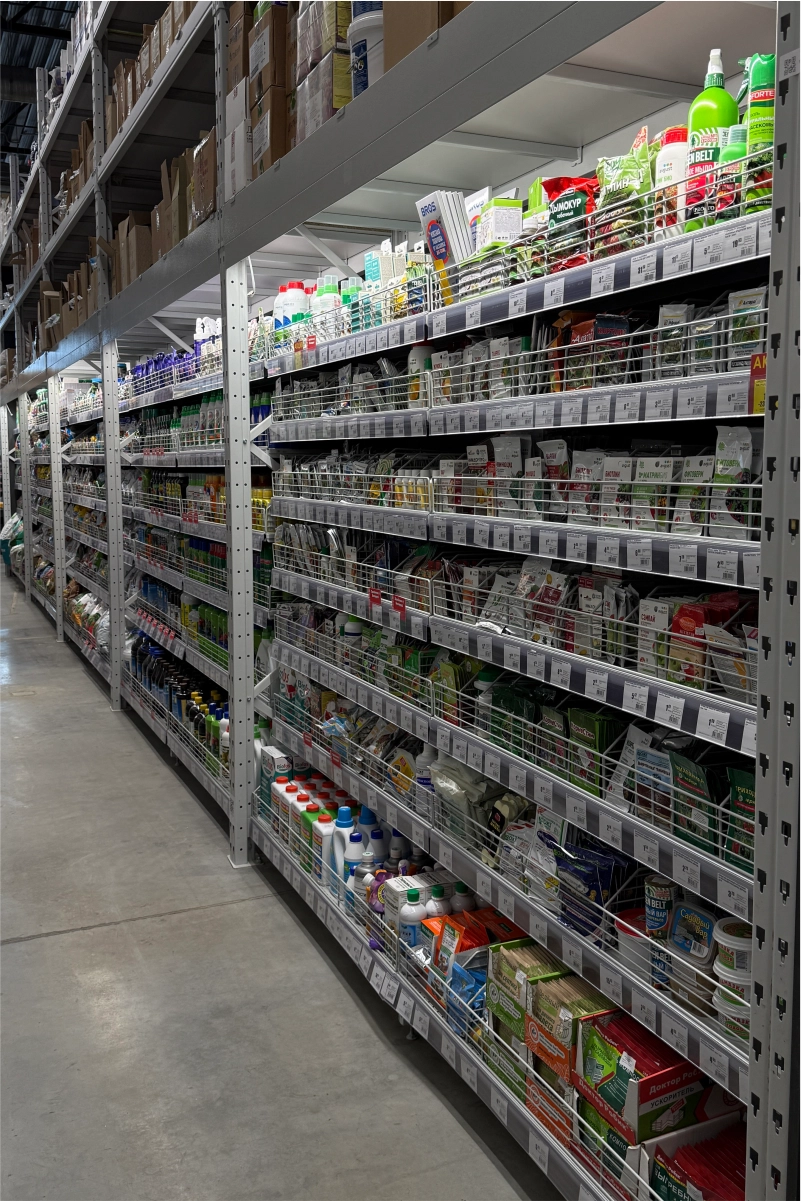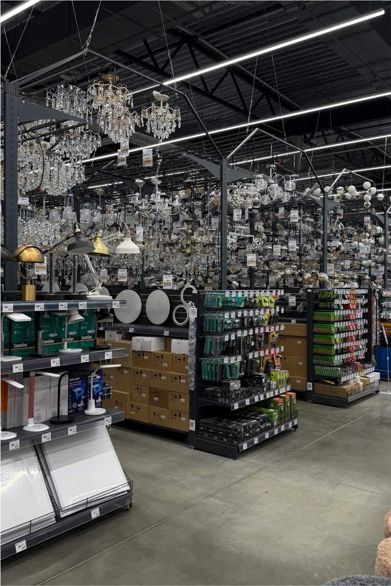 В торговом зале установлены металлические стеллажные системы, позволяющие эффективно размещать как мелкий крепёж и расходные материалы, так и крупные строительные товары — плитку, ламинат, сантехнику, электроинструмент. Оборудование выполнено из холоднокатаной стали толщиной 1,5–2,5 мм и покрыто порошковым полимерным составом, обеспечивающим долговечность и эстетичный внешний вид.