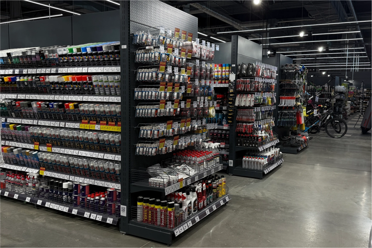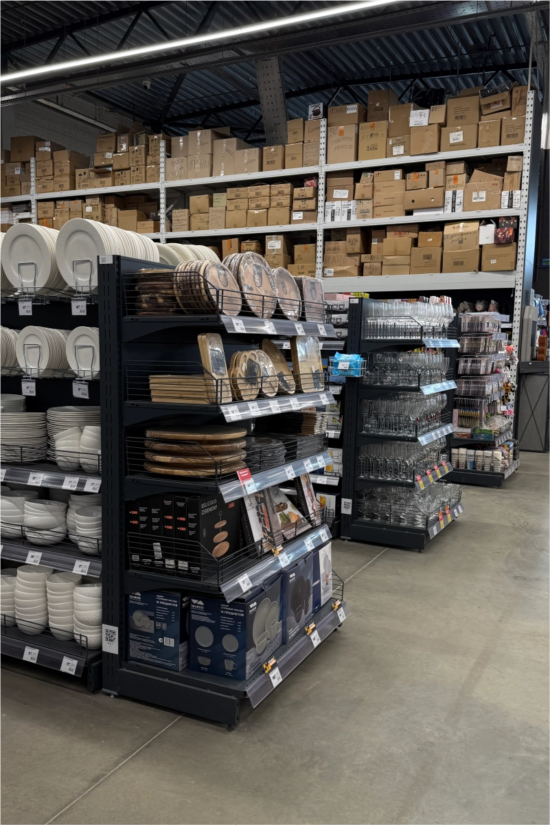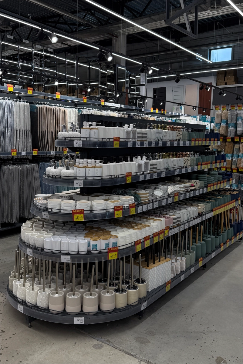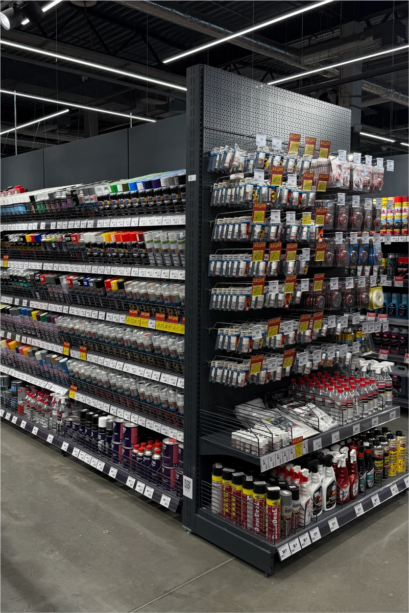 Для оснащения гипермаркета команда 4RM реализовала комплексное решение, включающее складские и торговые стеллажные системы, экспозиторы, демонстрационные стенды и специализированные элементы для различных товарных категорий.
