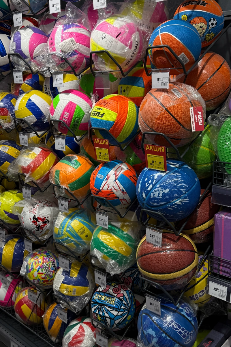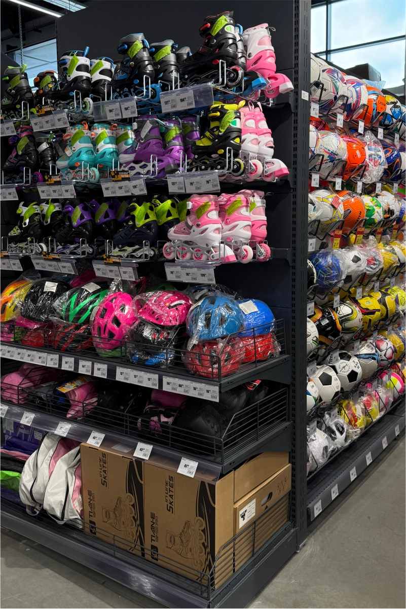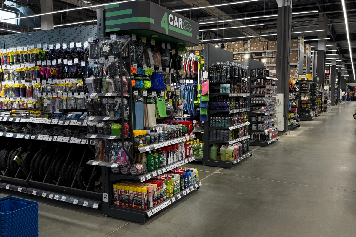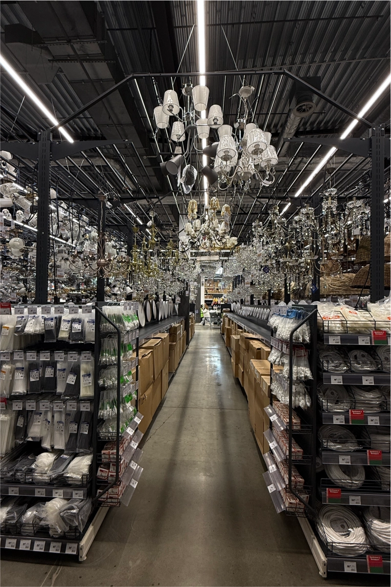 Для оснащения гипермаркета команда 4RM реализовала комплексное решение, включающее складские и торговые стеллажные системы, экспозиторы, демонстрационные стенды и специализированные элементы для различных товарных категорий.