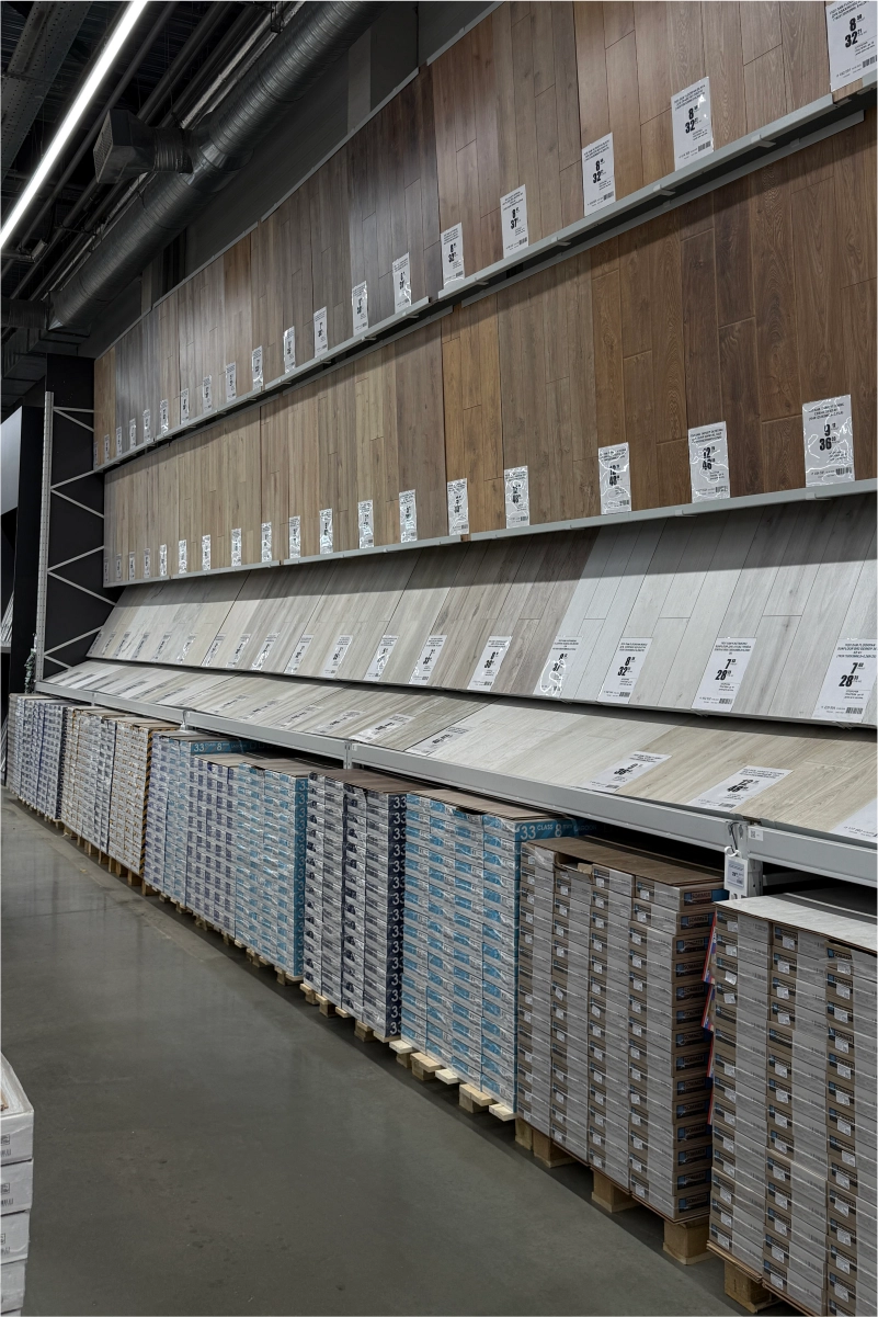 Вдоль периметра зала размещены пристенные конструкции с траверсами и интегрированными торговыми элементами. Они оснащены полками различной глубины, кронштейнами, навесными корзинами, перфорацией и эконом-панелями, а также имеют несколько уровней траверс для размещения товаров на паллетах. Такое решение позволяет одновременно хранить товарный запас и демонстрировать продукцию: плитку, обои, двери, сантехнику, светильники и прочее.