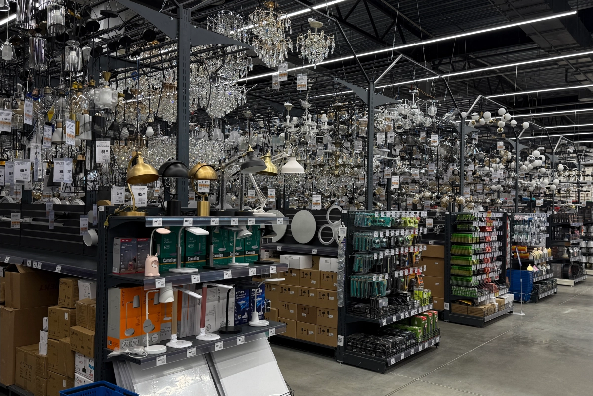 Для осветительных товаров реализовано сетчатое оборудование с подвесами для люстр и светильников. Также предусмотрены: